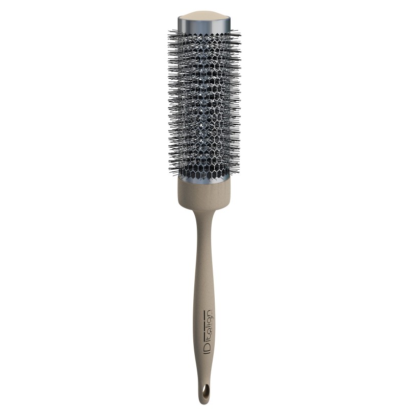 Es un cepillo térmico ecológico con un mango en material de paja orgánica de trigo y cáscara de arroz, un cilindro de aluminio revestido de cerámica y púas de plástico.